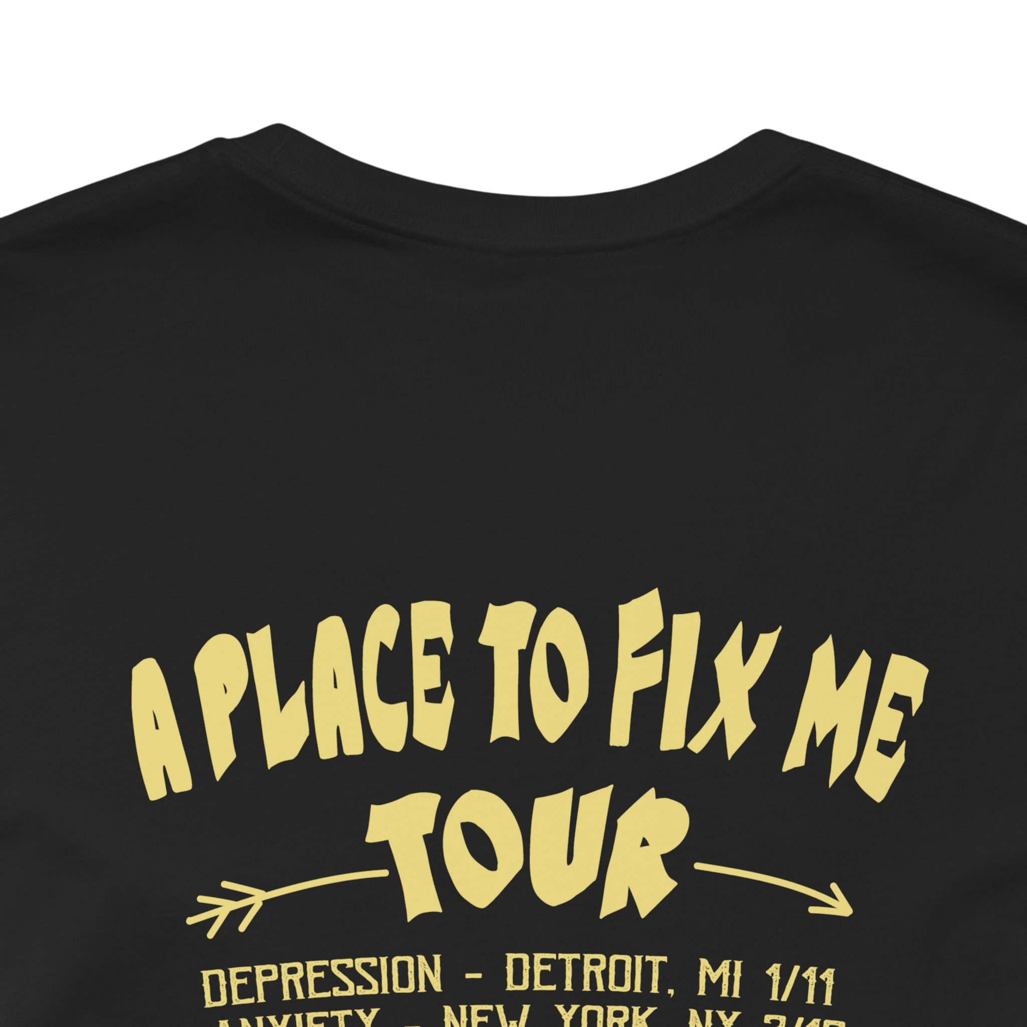 Soft, breathable cotton meets bold, nostalgic artwork — a tee that wears like a comfortable conversation. The front features a cracked, glittering heart stitched together with bandage-style tape, cassette tape and doodled motifs in bright purple and gold. Handwritten "Paige Raskin" name lettering above and the phrase “A Place to Fix Me” below gives it an intimate, slightly rebellious vibe. The back features mental health challenges on the A Place To Fix Me tour inviting healing and hope into the picture. Lightweight and easy to layer, this shirt sits neatly at the crew neckline and keeps shape with side seams and a ribbed knit collar. It’s the kind of top you reach for when you want to feel seen and a little nostalgic — whether you’re heading to a gig, a coffee shop, or just lounging at home with friends.